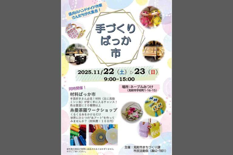 11月22日(土)、23日(日)の両日、ネーブルみつけを会場に恒例の「手づくりば...