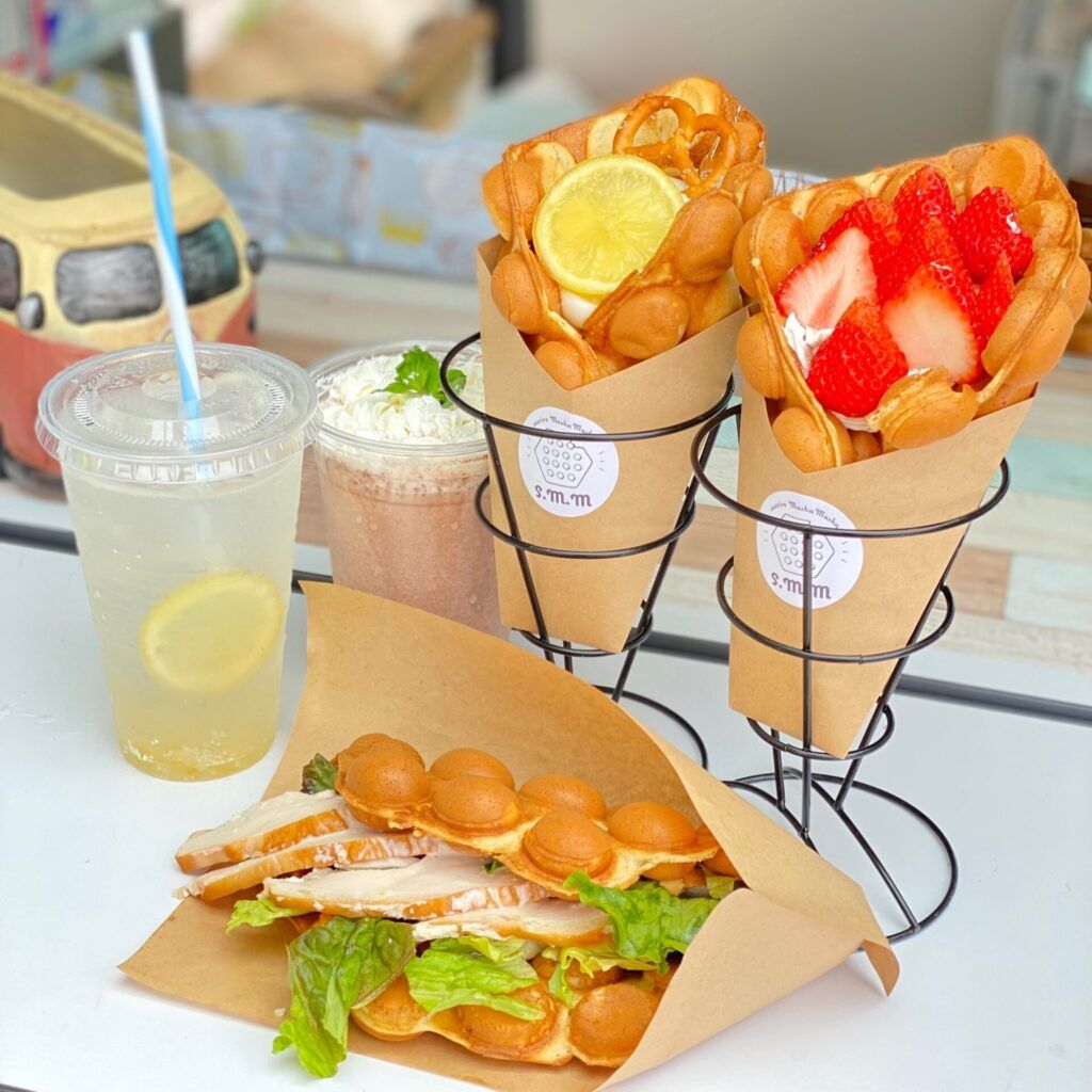 普通のワッフルとは一味ちがう♪サクッ!もちっ!のワッフル生地が自慢のバブルワッフル。国内産小麦使用。