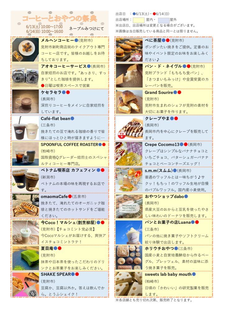 見附市の市民交流センター「ネーブルみつけ」にて、見附市内及び新潟県内の飲食店やキッチンカーによるコーヒーと菓子類の販売を中心とした飲食イベントを初開催します!