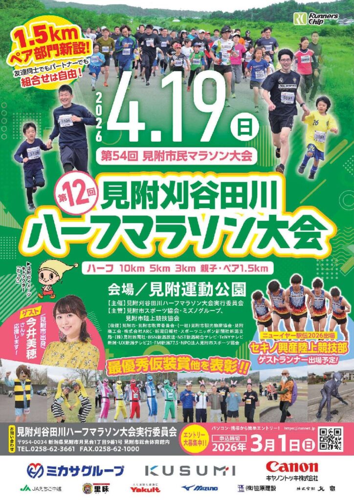 マラソンコース・参加料等の詳しい内容は、「第12回見附刈谷田川ハーフマラソン大会・第54回見附市民マラソン大会」パンフレット(PDF)または、公式ホームページの大会概要・注意事項をご確認ください。たくさん方のご参加をお待ちしています。