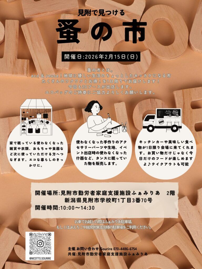 蚤の市は、エコやリユースを目的として開催します。ハンドメイド・ハンドメイドアウトレット品、ハンドメイド品の材料や自宅の不用品などの販売をします。ハンドメイドイベントではありません。・家に眠っているハンドメイド資材・家に眠っているハンドメイド品・イベント等で使えそうな自身で使わなくなった什器やトレー・家に眠っている使わない雑貨、食器、衣類等のリサイクル品など今回もー!20ブース出店!キッチンカーもくるよ♪この機会に掘り出し物を見つけにきてね♪ご来店をお待ちしております♪