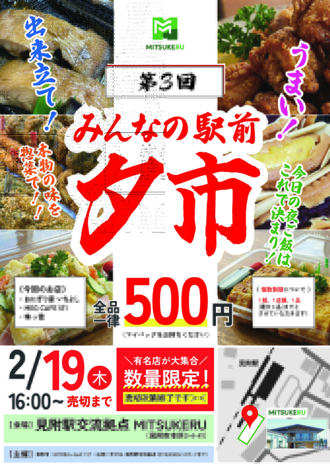 駅前で「ちょっと楽しい夕ごはん」はいかがですか?市内のお店のお総菜やグルメ、スイーツを、見附駅交流拠点「MITSUKERU(ミツケル)」で販売する夕市です。【各店1品500円】で販売します。(数量限定)有名店が大集合!第3回目は…・おにぎり家 いちよし・MEG CAFE 511・味っ佳(個数制限あり)(売れ切れ次第終了です ><)マイバックをお持ちください。ご家族やお友だちと、ぜひお気軽にお越しください!