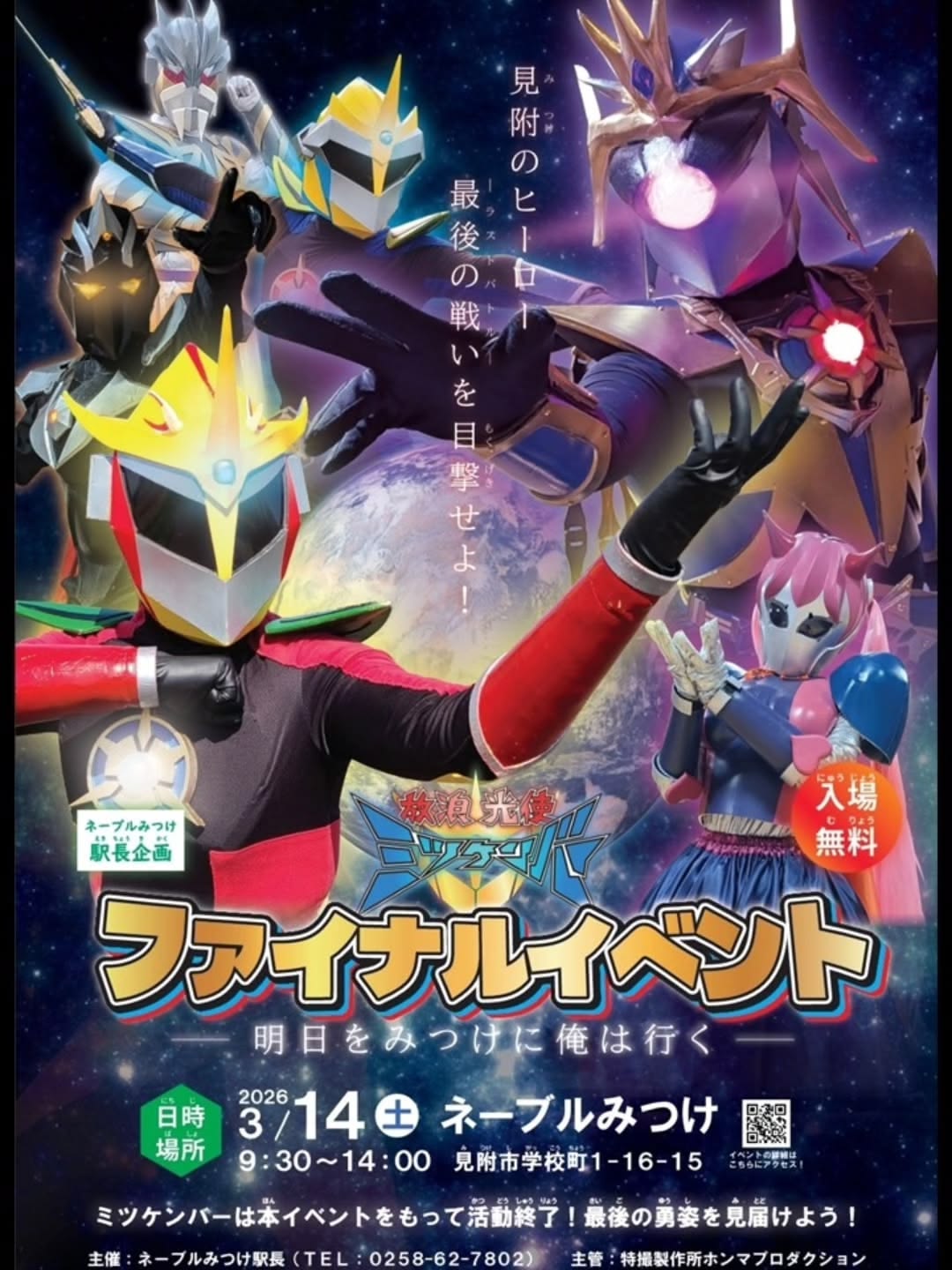 「私が今町中学校3年生の時からサークル活動のなかで15年続けてきた『放浪光使ミツケンバー』は本イベントをもって活動終了となります。物語のラストを見届け、ミツケンバーと触れ合える最後の機会です。応援してくれた方々、見附市民の皆様、作品制作やイベント等で関わったすべての皆様へこれまでの感謝をこめて開催します。3月14日はネーブルみつけにぜひお越しください。」
