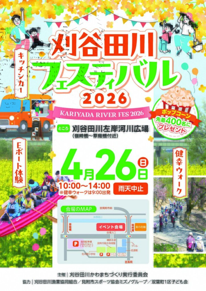 見附市の刈谷田川左岸河川広場で「刈谷田川フェスティバル」を開催します。