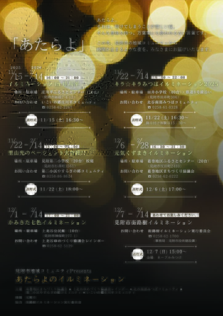 万葉集の一句にも使われる「あたらよ」とは、明けてしまうのが惜しい夜を意味する古い言葉です。この冬、時間が止まるような一夜をお届けするため、見附市の地域コミュニティが、それぞれに心を込めてイルミネーションを灯します。