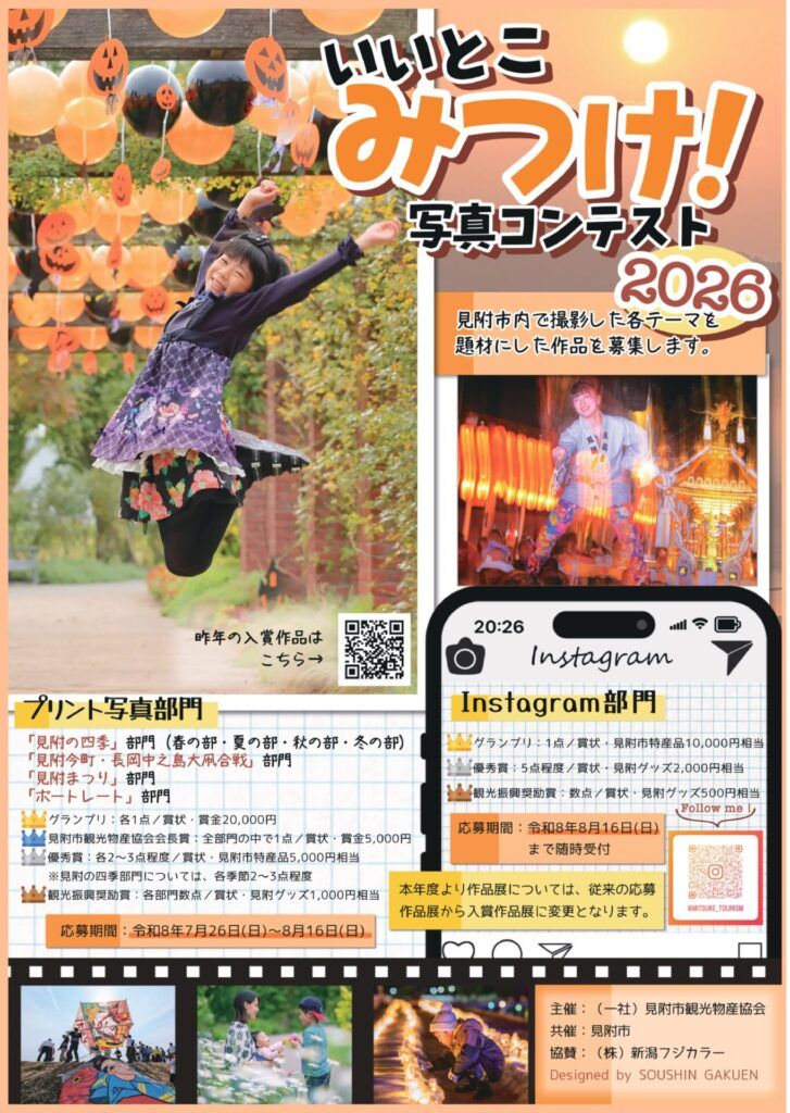 また、全ての入賞作品は見附市観光情報サイト「いいとこミッケ」内にある、「みつけフォトギャラリー」に掲載させて頂きます。(「みつけフォトギャラリー」は、「使用に関する注意事項」を順守することで、どなたでも無料で写真をダウンロードして自由に利用できるサービスです。)